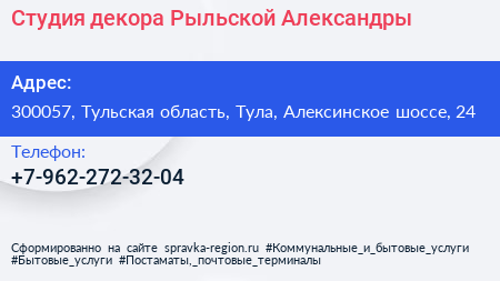Студия декора Рыльской Александры по адресу 300057, Тульская область, Тула, Алексинское шоссе, 24 в дальнейшем Организация, размещена в следующих категориях: