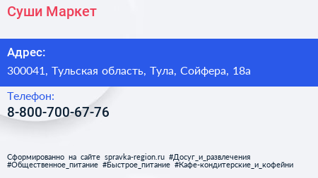 Суши-Маркет по адресу 300041, Тульская область, Тула, Сойфера, 18а в дальнейшем Организация, размещена в следующих категориях: