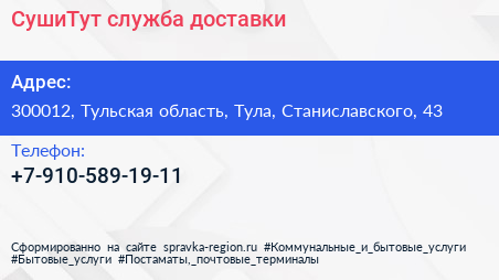 СушиТут, служба доставки по адресу 300012, Тульская область, Тула, Станиславского, 43 в дальнейшем Организация, размещена в следующих категориях: