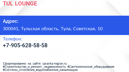 TUL LOUNGE по адресу 300041, Тульская область, Тула, Советская, 10 в дальнейшем Организация, размещена в следующих категориях: