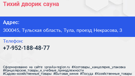 Тихий дворик, сауна по адресу 300045, Тульская область, Тула, проезд Некрасова, 3 в дальнейшем Организация, размещена в следующих категориях: