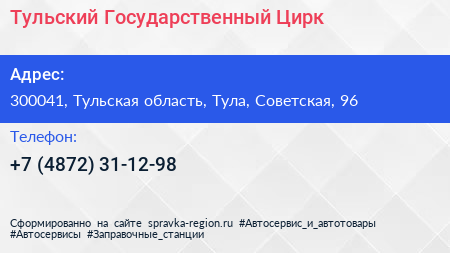 Тульский Государственный Цирк по адресу 300041, Тульская область, Тула, Советская, 96 в дальнейшем Организация, размещена в следующих категориях: