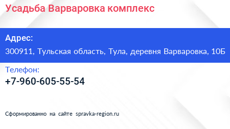 Усадьба Варваровка, комплекс по адресу 300911, Тульская область, Тула, деревня Варваровка, 10Б в дальнейшем Организация, размещена в следующих категориях: