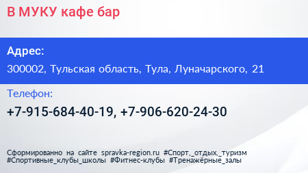 В МУКУ, кафе-бар по адресу 300002, Тульская область, Тула, Луначарского, 21 в дальнейшем Организация, размещена в следующих категориях:
