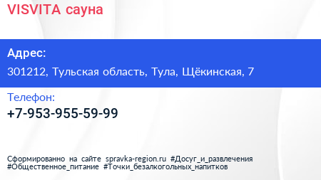 VISVITA, сауна по адресу 301212, Тульская область, Тула, Щёкинская, 7 в дальнейшем Организация, размещена в следующих категориях: