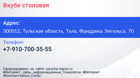 Вкубе, столовая по адресу 300012, Тульская область, Тула, Фридриха Энгельса, 70 в дальнейшем Организация, размещена в следующих категориях: