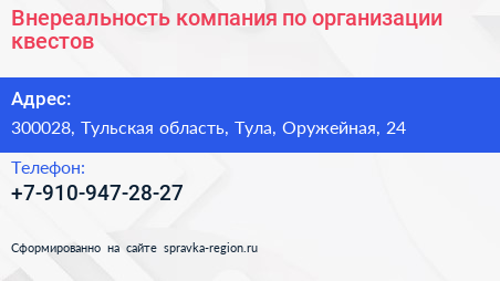 Внереальность, компания по организации квестов по адресу 300028, Тульская область, Тула, Оружейная, 24 в дальнейшем Организация, размещена в следующих категориях: