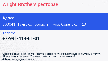Wright Brothers, ресторан по адресу 300041, Тульская область, Тула, Советская, 10 в дальнейшем Организация, размещена в следующих категориях: