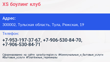 XS, боулинг-клуб по адресу 300002, Тульская область, Тула, Ряжская, 19 в дальнейшем Организация, размещена в следующих категориях: