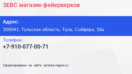 ЗЕВС, магазин фейерверков по адресу 300041, Тульская область, Тула, Сойфера, 18а в дальнейшем Организация, размещена в следующих категориях: