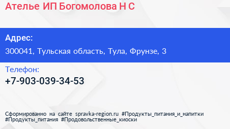 Ателье, ИП Богомолова Н.С. по адресу 300041, Тульская область, Тула, Фрунзе, 3 в дальнейшем Организация, размещена в следующих категориях: