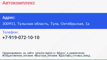 Автокомплекс по адресу 300911, Тульская область, Тула, Октябрьская, 1а в дальнейшем Организация, размещена в следующих категориях: