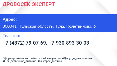 ДРОВОСЕК ЭКСПЕРТ по адресу 300041, Тульская область, Тула, Колетвинова, 6 в дальнейшем Организация, размещена в следующих категориях: