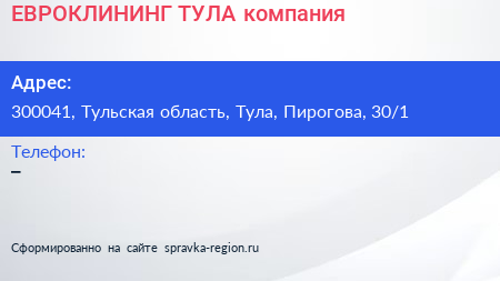 ЕВРОКЛИНИНГ ТУЛА, компания по адресу 300041, Тульская область, Тула, Пирогова, 30/1 в дальнейшем Организация, размещена в следующих категориях: