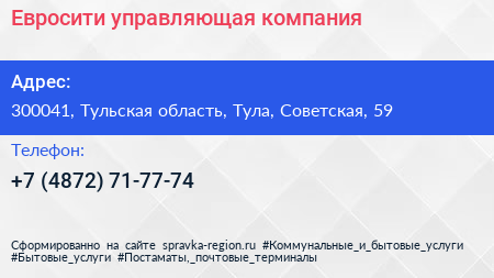 Евросити, управляющая компания по адресу 300041, Тульская область, Тула, Советская, 59 в дальнейшем Организация, размещена в следующих категориях: