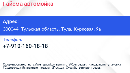 Гайсма, автомойка по адресу 300044, Тульская область, Тула, Курковая, 9а в дальнейшем Организация, размещена в следующих категориях: