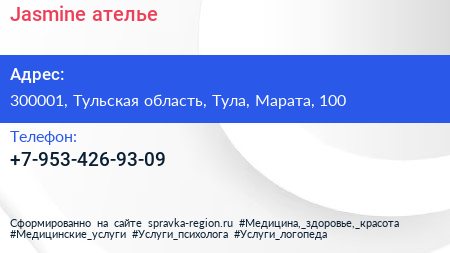 Jasmine, ателье по адресу 300001, Тульская область, Тула, Марата, 100 в дальнейшем Организация, размещена в следующих категориях: