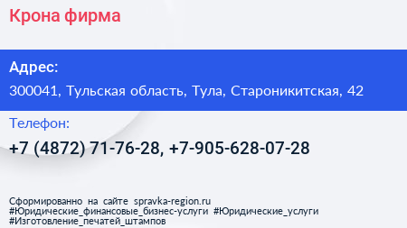 Крона, фирма по адресу 300041, Тульская область, Тула, Староникитская, 42 в дальнейшем Организация, размещена в следующих категориях:
