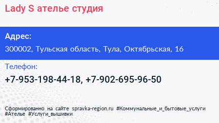 Lady-S, ателье-студия по адресу 300002, Тульская область, Тула, Октябрьская, 16 в дальнейшем Организация, размещена в следующих категориях: