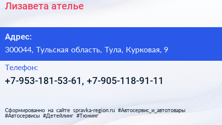 Лизавета, ателье по адресу 300044, Тульская область, Тула, Курковая, 9 в дальнейшем Организация, размещена в следующих категориях: