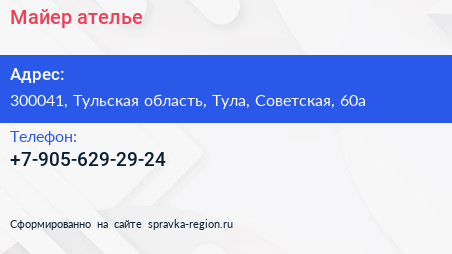 Майер, ателье по адресу 300041, Тульская область, Тула, Советская, 60а в дальнейшем Организация, размещена в следующих категориях: