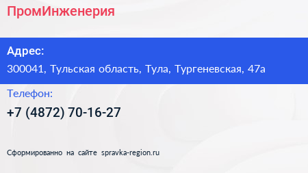 ПромИнженерия по адресу 300041, Тульская область, Тула, Тургеневская, 47а в дальнейшем Организация, размещена в следующих категориях: