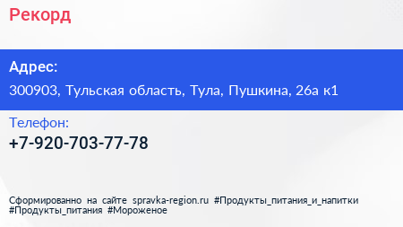 Рекорд по адресу 300903, Тульская область, Тула, Пушкина, 26а к1 в дальнейшем Организация, размещена в следующих категориях: