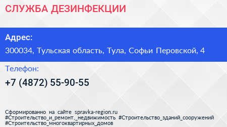 СЛУЖБА ДЕЗИНФЕКЦИИ по адресу 300034, Тульская область, Тула, Софьи Перовской, 4 в дальнейшем Организация, размещена в следующих категориях: