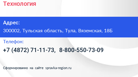 Технология по адресу 300002, Тульская область, Тула, Вяземская, 18Б в дальнейшем Организация, размещена в следующих категориях: