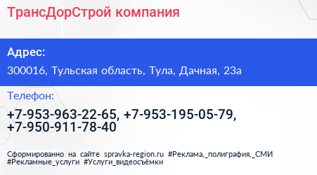 ТрансДорСтрой, компания по адресу 300016, Тульская область, Тула, Дачная, 23а в дальнейшем Организация, размещена в следующих категориях: