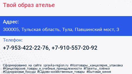 Твой образ, ателье по адресу 300005, Тульская область, Тула, Павшинский мост, 3 в дальнейшем Организация, размещена в следующих категориях: