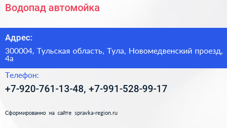Водопад, автомойка по адресу 300004, Тульская область, Тула, Новомедвенский проезд, 4а в дальнейшем Организация, размещена в следующих категориях:
