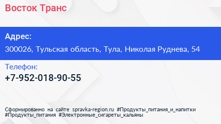 Восток Транс по адресу 300026, Тульская область, Тула, Николая Руднева, 54 в дальнейшем Организация, размещена в следующих категориях:
