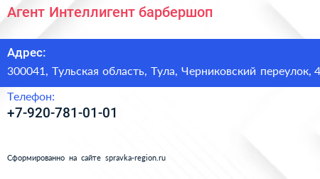 Агент-Интеллигент, барбершоп по адресу 300041, Тульская область, Тула, Черниковский переулок, 4 в дальнейшем Организация, размещена в следующих категориях: