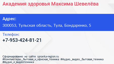 Академия здоровья Максима Шевелёва по адресу 300053, Тульская область, Тула, Бондаренко, 5 в дальнейшем Организация, размещена в следующих категориях: