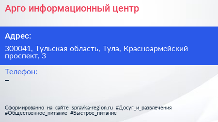 Арго, информационный центр по адресу 300041, Тульская область, Тула, Красноармейский проспект, 3 в дальнейшем Организация, размещена в следующих категориях: