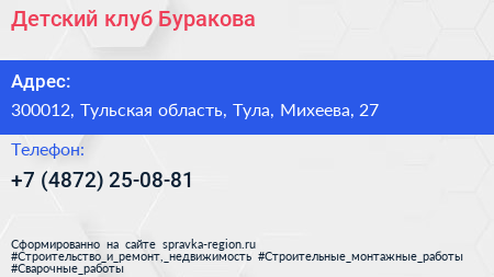 Детский клуб Буракова по адресу 300012, Тульская область, Тула, Михеева, 27 в дальнейшем Организация, размещена в следующих категориях: