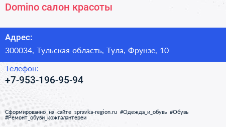 Domino, салон красоты по адресу 300034, Тульская область, Тула, Фрунзе, 10 в дальнейшем Организация, размещена в следующих категориях: