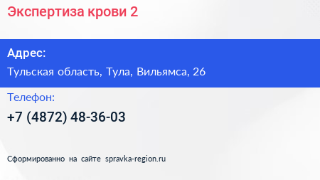 Экспертиза крови-2 по адресу Тульская область, Тула, Вильямса, 26 в дальнейшем Организация, размещена в следующих категориях: