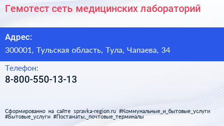 Гемотест, сеть медицинских лабораторий по адресу 300001, Тульская область, Тула, Чапаева, 34 в дальнейшем Организация, размещена в следующих категориях: