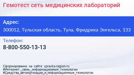 Гемотест, сеть медицинских лабораторий по адресу 300012, Тульская область, Тула, Фридриха Энгельса, 133 в дальнейшем Организация, размещена в следующих категориях: