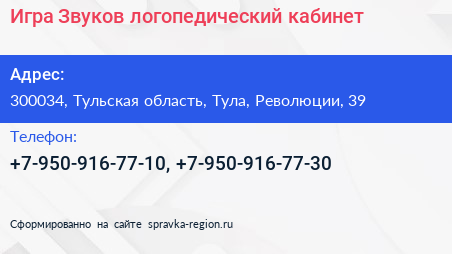 Игра Звуков, логопедический кабинет по адресу 300034, Тульская область, Тула, Революции, 39 в дальнейшем Организация, размещена в следующих категориях:
