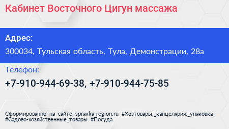Кабинет Восточного Цигун-массажа по адресу 300034, Тульская область, Тула, Демонстрации, 28а в дальнейшем Организация, размещена в следующих категориях: