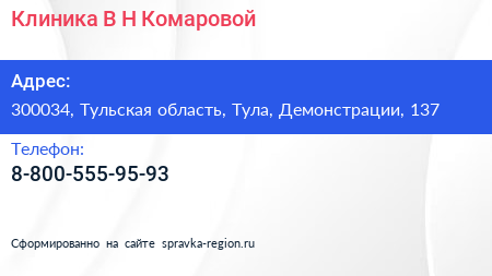 Клиника В.Н. Комаровой по адресу 300034, Тульская область, Тула, Демонстрации, 137 в дальнейшем Организация, размещена в следующих категориях: