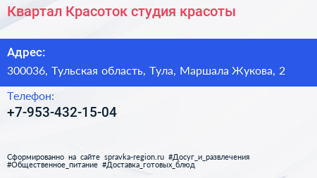 Квартал Красоток, студия красоты по адресу 300036, Тульская область, Тула, Маршала Жукова, 2 в дальнейшем Организация, размещена в следующих категориях: