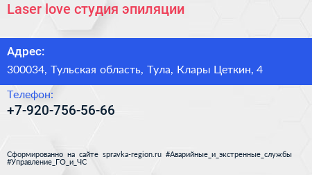 Laser love, студия эпиляции по адресу 300034, Тульская область, Тула, Клары Цеткин, 4 в дальнейшем Организация, размещена в следующих категориях: