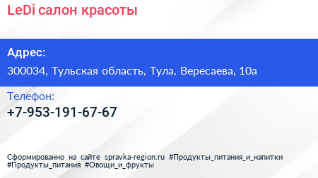LeDi, салон красоты по адресу 300034, Тульская область, Тула, Вересаева, 10а в дальнейшем Организация, размещена в следующих категориях: