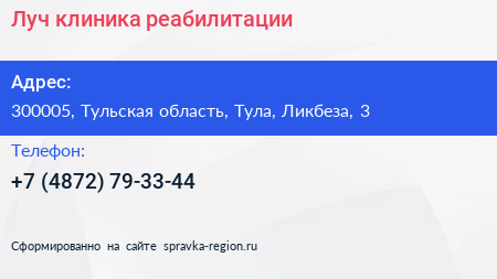 Луч, клиника реабилитации по адресу 300005, Тульская область, Тула, Ликбеза, 3 в дальнейшем Организация, размещена в следующих категориях: