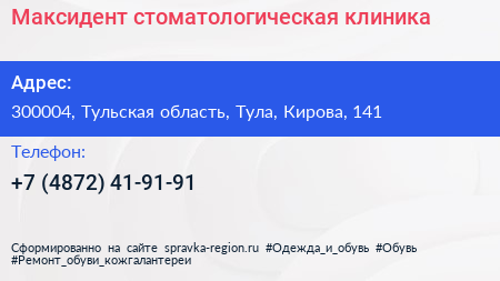 Максидент, стоматологическая клиника по адресу 300004, Тульская область, Тула, Кирова, 141 в дальнейшем Организация, размещена в следующих категориях: