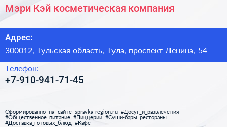 Мэри Кэй, косметическая компания по адресу 300012, Тульская область, Тула, проспект Ленина, 54 в дальнейшем Организация, размещена в следующих категориях: